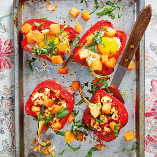 - Remove the veg from the oven and carefully crack a free-range egg into each of the half-filled peppers. Then crumble the feta over the fully-filled halves, scatter the cubed bread around the tray and return everything to the oven for another 10–15 minutes.